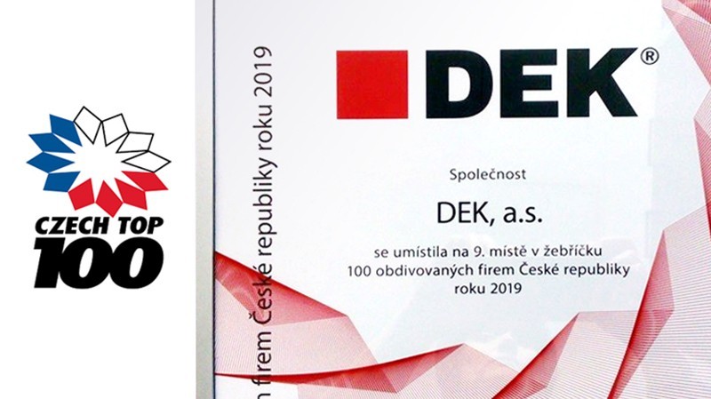 Společnost DEK a.s. se umístila na skvělém 9. místě v anketě o nejobdivovanější firmu České republiky CZECH TOP 100 obdivovaných firem roku 2019. Do první desítky jsme se probojovali společně s firmami jako je ŠKODA AUTO, ČEZ, KOFOLA nebo ALZA z celkem 930 nominovaných firem. Je to ohromný úspěch a máme z něj velkou radost.