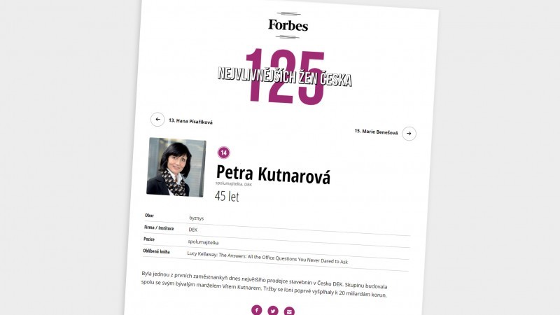 Časopis Forbes vydal nový žebříček 125 nejvlivnějších žen Česka, ve kterém na jednom z předních míst figuruje spolumajitelka Stavebnin DEK Petra Kutnarová. Blahopřejeme!